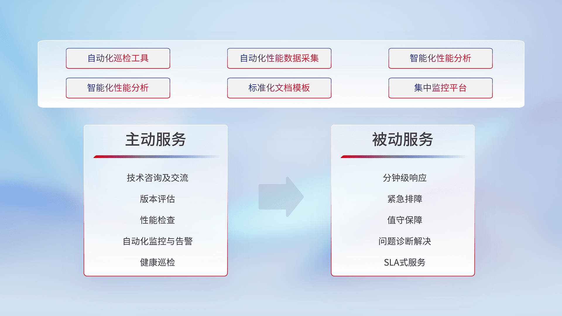 智能化工具和标准化文档,,保障服务质量,,,,提供主动服务(包含技术咨询、、、版本评估、、、、性能检查、、、自动化监控与告警、、、健康巡检)和被动服务包含(分钟级响应、、、紧急排障、、、值守保障、、、问题诊断解决、、、、SLA服务)。。。